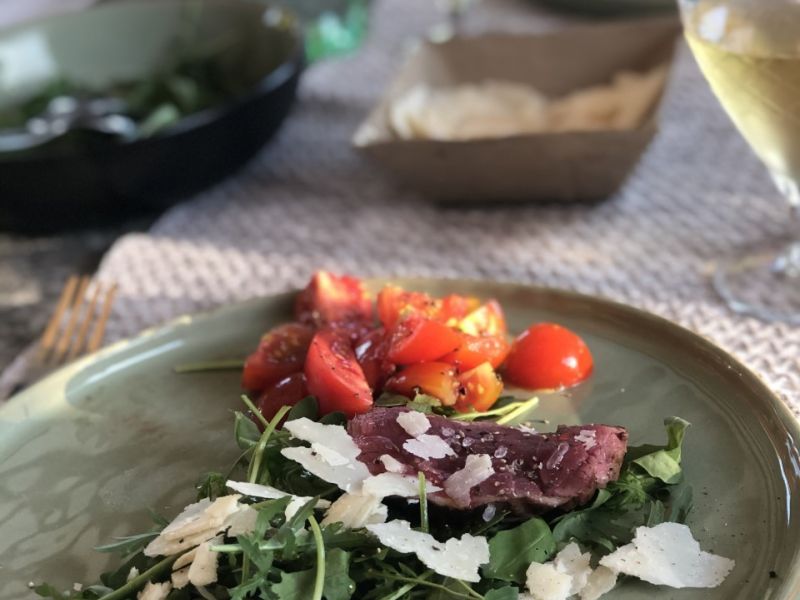 Take the sharpest knife you have and start slicing those fingerlicking slices and smash them on the big plate full of rocket salad. Finish with some parmegiano and olive oil.